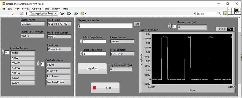 The COM object supplied by Ophir is easy to use and allows access to all of the display's functions. The LabVIEW application shown here is a simple example of how to use the Centauri to capture power measurement at 10KHz in an automated environment.