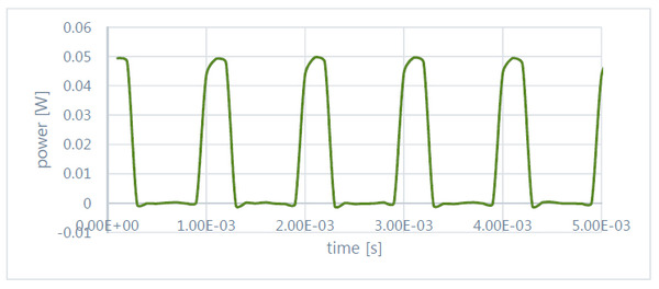 Next, press the 'log – 1 sec' button to acquire 1 sec of power measurement data samples at 10 kHz. The data is stored as a 1D array and will be saved as a .csv file. Figure 3 shows the power measurement of a VCSEL pulsing at 1KHz obtained via the LabVIEW application.