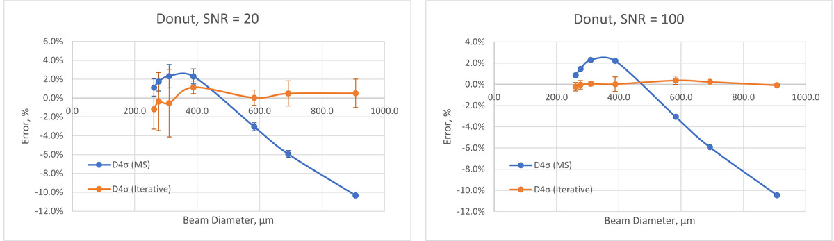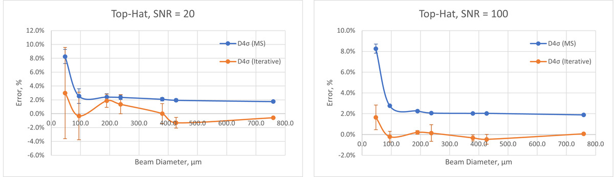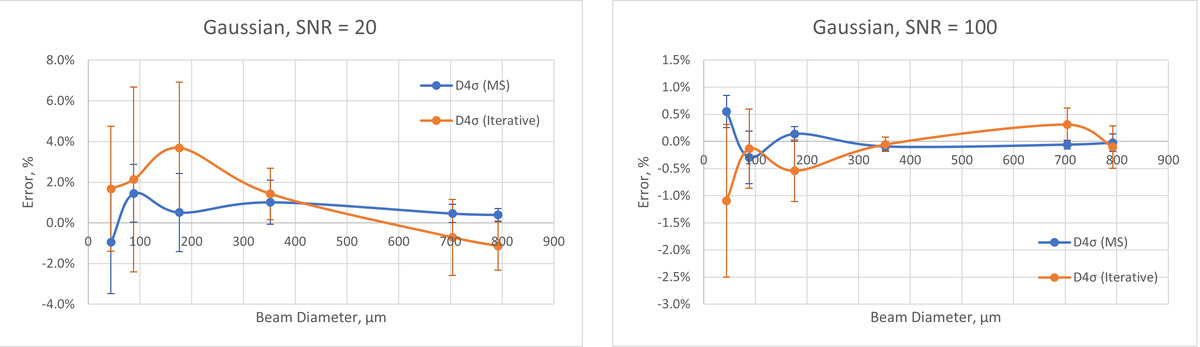To compare the accuracy of the D4σ (Moving Slit) and the D4σ (Iterative) methods, multiple types of beam models were simulated with different profiles and beam widths. Noise was added and the profiles were blurred to simulate the BeamWatch optical system. The simulated data were then processed using the BeamWatch algorithms and results were compared against the initial beam parameters.