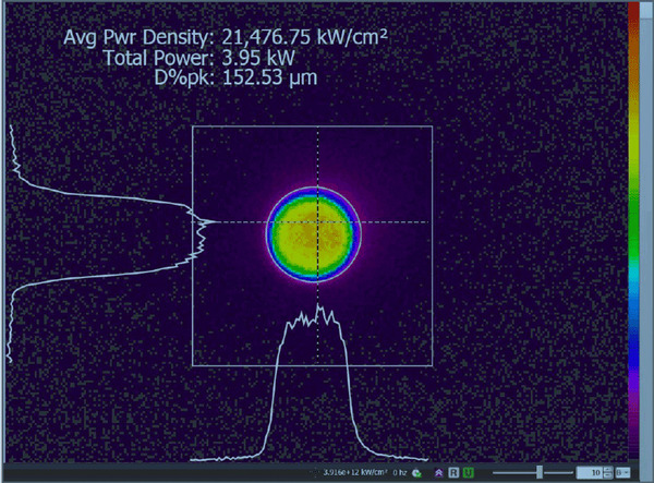 The result is a beam profiler system that easily measures high power beam at focus in a compact package. This system was used to capture a 4 kW fiber laser focused to a spot size of 150 microns (see Figure 1). The system measures beams as small as 37 microns.