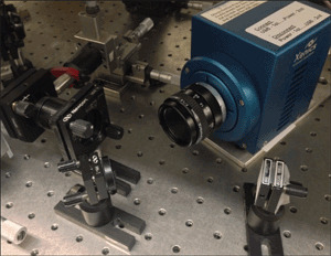 In this optical arrangement, the beam source was toward the left of the camera, reflected off an image surface to the right of the camera, back onto a reflective surface into the lens of the XC130 camera. With signal loss at each beam transfer, the XC130 camera using Spiricon BeamGage Professional beam diagnostic software was more than sufficient to image and profile the resulting image.