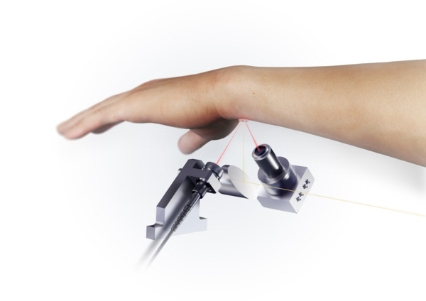 The measurement works based on infrared spectroscopy, and specifically the principle of photothermic deflection. For this purpose, a quantum cascade laser (QCL) radiates mid-infrared pulses in wavelengths ranging between 8 and 11μm into the skin. The pulses of these wavelengths pass through the sensor element and excite the glucose molecules to oscillate briefly. With the fast relaxation a small amount of heat is given off to the environment. At the skin surface this results in a minimal increase in temperature. In the sensor element (internal reflection element – IRE), the thermal gradient causes a thermal lens effect. The probe beam of a red laser diode is deflected by this thermal lens as it passes through the IRE. The deflection is measured by a positionsensitive photodiode; the device calculates the glucose concentration based on the deflection. A clinical study with 36 subjects conducted at an external institute, which was concluded in 2024 shows results comparable to early stage continuous glucose monitoring devices (CGMs), that got approved by the FDA.