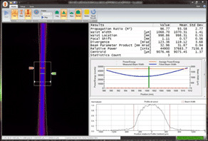 The system includes software designed for the laser technician that provides measurement of laser spot (or “beam waist”) size, and the location of the spot over time. The laser user can measure and graph how much and how quickly the spot shifts to better characterize their laser system. In non-contact beam measurement, the camera coupled with a telecentric lens is viewing the laser’s Rayleigh length, which is not only the focused spot, but the beam path above and below the focused spot. As a result, Beam Divergence, M2, and Beam Parameter Product (or BPP) measurements can be provided real-time. The system also includes an optional, simplified “user interface” which displays Green and Red Go/No-Go readings on key laser parameters based on predefined user specifications for quick periodic checks of the overall laser system.