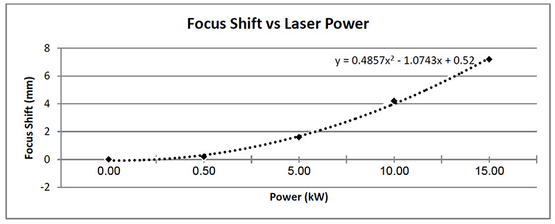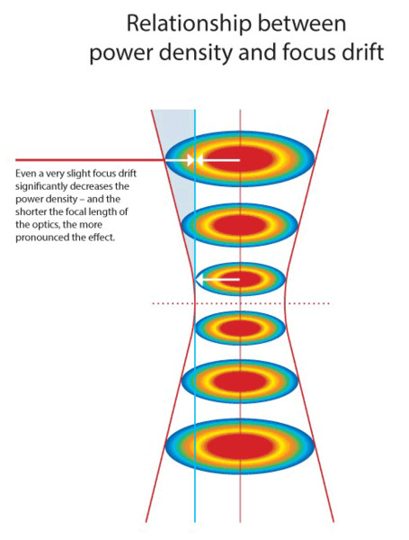 Figure 2. Even a very slight focus drift significantly decreases the power density -- and the shorter the focal length of the optics, the more pronounced the effect.