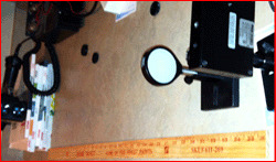 For the second testing method, a 2” Opalescent window was used to diffuse the overall beam rather than block it with an aperture. This was done by aiming the beam on to one side of the diffuser and imaging the backside of the diffuser with a 25mm CCTV lens attached to the SP620 profiling camera. Figure 5 shows the crude setup.