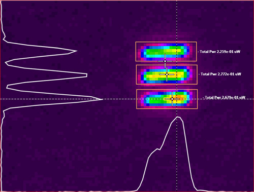 Using a PD300 sensor and Vega meter to measure the overall output at 131 μW, and calibrating the BeamGage software to read out the power, it was easy to draw partitions around each diode to measure the output and analyze the spatial resolution of each emitter.