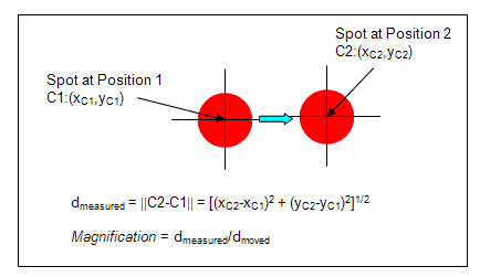 As a general guideline, choose an appropriate position shift for the calibration, based on the aperture or CCD array dimensions. For example with a 6.49 mm x 4.83 mm CCD and a 100 μm 1/e2 spot diameter with 10x magnification, it is possible to move the spot a maximum of ~225 μm to either side of center, and only ~140 μm on either side of center in the vertical direction. Translate the beam a known distance to one side in x, and record the new centroid positions. Move the beam back to the center of the array and again record the centroid position. Now move the beam to the other side of the centroid and record the new centroids. The data provides the distance between “known” positions, and thus two measures of the magnification. An average of the numbers can be used for the calibrated magnification. If desired, the procedure can be repeated in the y direction.
