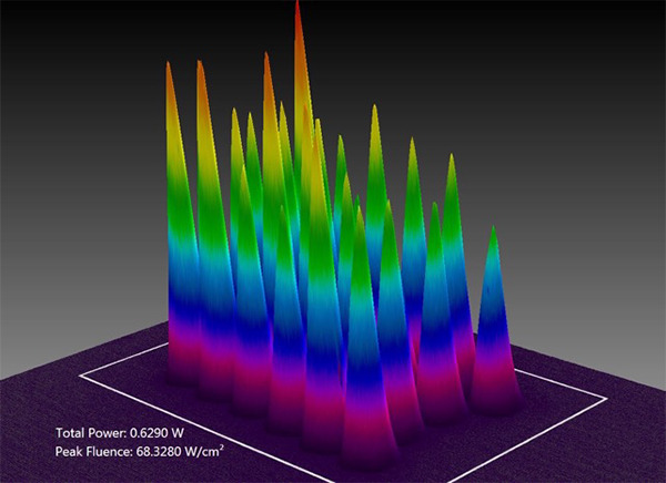 The unit on the left has a total integrated optical power of 310 mW and average power density of 3.26 Watt/cm2. The device on the right has total power of 714 mW and an average irradiance or power density of 1.19 Watts/cm2. The system can be calibrated for total intensity or radiant existence with the use of a integrating sphere and silicon photo diode sensor. The total integrated power is read by Ophir’s BeamGage software application, providing a 2-dimensional map of the intensity distribution of the light source under test. Once calibrated for total intensity and effective pixel spacing, each pixel has a power density value associated with it.