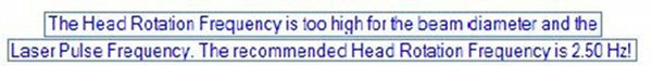 A minimum of 15 pulses per single scan is required to obtain the specified accuracy. This condition depends on the laser spot size and the scanhead scan rate. If there are not enough pulses present in a single scan (<15), the software computes the corresponding head scan rate and displays a message in the Message Window (see below) recommending a lower head speed.