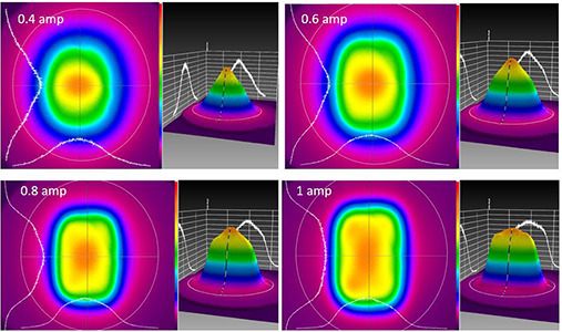 Figure 4 is a graph of the beam shape change vs current. It clearly shows that the Gaussian beam becomes flat top and shifts to dual mode once the current changes from 0.74 A to 0.92 A.