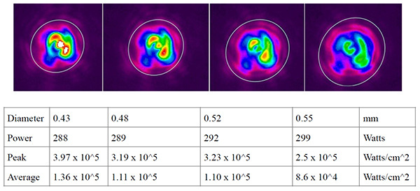 As you can see in Figure 4, as the delivery system heats up the beam, it is spread slightly. The consequences of this slight enlargement of the beam can clearly be seen in the computed peak and average power within the beam.