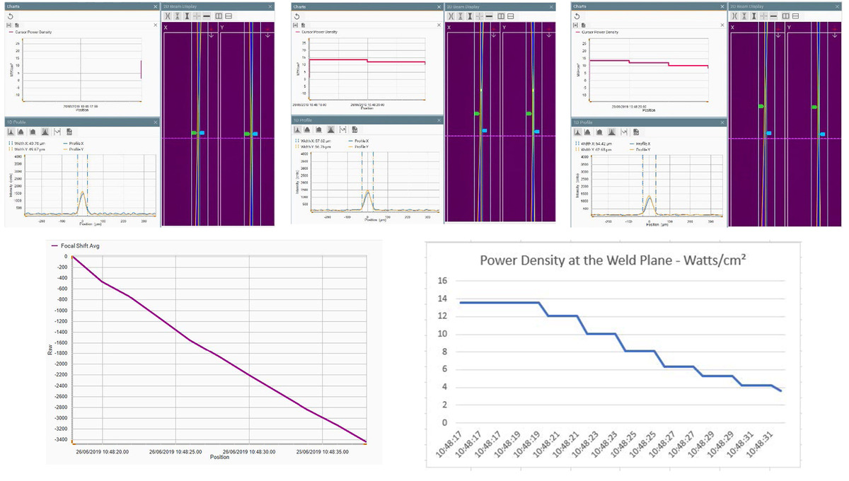 As shown in Figure 2, three screen captures of the BeamWatch application indicate progressive changes in the power density of the beam delivered to the weld plane. As the focal plane shifts toward the delivery optics, the power density at the weld plane decreases from 13.5MW/cm² to less than 4MW/cm². This change in the laser irradiance presented to the powder would cause catastrophic quality issues at this portion of the build.