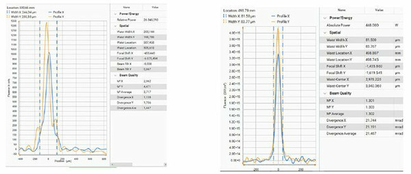 Using BeamWatch AM, we can see in the left graph a diffraction influencing the laser beam; on the right, there is a clear Gaussian profile. The focus shift and the different direction of the beam from X- to Y-axis result in reduced power density within the larger focal point. This explains the deterioration of the surface and loss of material strength.
