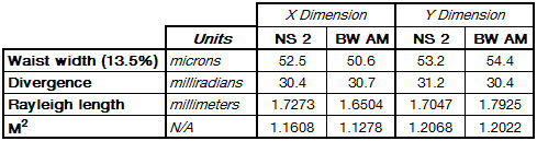 Since the raw Rayleigh-scatter data is only proportionally representative of actual beam measurements, some processing is performed in order to improve signal-to-noise and reduce variance. As with our other applications, this process includes some basic data filters and a background subtraction to ensure that the measurements reported provide a precise representation of the beam. Additionally, we utilize a proprietary data model to account for the signal-to-noise differential between the edges and center of the beam section selected for study. This differential occurs due to a combination of factors including lens selection, beam divergence, and the design of the BeamWatch AM device itself. The entire system has been extensively tested to ensure accuracy and reproducibility in a variety of conditions. A comparison of measurements taken with the NanoScan 2, our ISO 11146 compliant full-contact scanning slit beam profiler, and the BeamWatch AM Rayleigh-scatter beam profiler shows similar results to each other. This is presented in the chart (Table 2) below.