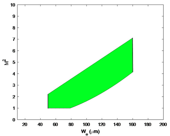 The largest component of the previously mentioned proprietary model that is used for post-backgroundsubtraction baseline correction involves a Fourier transform method as recommended by ISO 11146-3 section 3.4. Since BeamWatch AM measures a significant length of the beam at once, including the waist, initial determination of beam waist location, beam width, divergence angles, and beam propagation ratios are easily obtained from a hyperbolic fit along the propagation axis. This procedure is detailed in ISO 11146-1 section 9, and is functionally equivalent to measuring at hundreds of locations along the beam separately with the NanoScan 2. Two items of note here are the positioning requirements of the fitting method, as well as the fact that the method applies only to beams that are stigmatic or simply astigmatic. As for the latter caveat, we assume our target users to be utilizing round fibers and any astigmatism induced by delivery heads to be simple. It is the user’s responsibility to determine if their beam is an appropriate candidate for use in BeamWatch AM. However, an operating space chart has been provided in Figure 1 to the right for further assistance.
