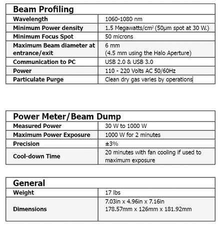 BeamWatch AM is the newest member of Ophir-Spiricon’s family of beam monitoring systems. It has been designed specifically for use in the additive manufacturing industry to provide non-interfering real-time beam measurement at the location of the working plane. Rigorous testing has been performed to ensure it meets the specifications detailed in Table 1 to the right.