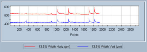 Because we expected to see thermal effects in the initial experimental design (Method 1), we used time charting to observe the measurement of the laser. In order to see any effects and eliminate any contribution from the laser itself, we started the camera and then uncovered the laser beam. There was an immediate spike of the beam size to around 700μm. It settled to a value around 500μm (1/e2) within a few milliseconds. With each measurement we saw a similar pattern, however the value of the initial spike was somewhat variable.