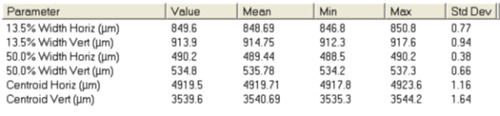 When this same experiment was repeated using the front surface reflection attenuator, the spiking effect was no longer visible and the beam measurement was ~850μm in one axis and 914μm in the other.