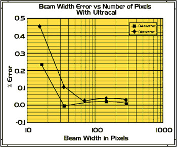 Figure 1 illustrates the calculated beam width error vs. beam size without all components of Spiricon's Ultracal algorithms. Note that in a 512X512 camera array, a beam width only as small as 64X64 is calculated at 60% error using the D4 method. This theoretically confirms previous reports of the errors generated by the presence of noise in D4 measurements. Also shown in Figure 1, is the beam width error calculated using the conventional knife-edge DKE method, which generates only 3% error at 64X64 beam size. Thus, while D4 is the theoretically correct way to measure a beam width, the practical problems of noise in the camera, have precluded its use up to this point.