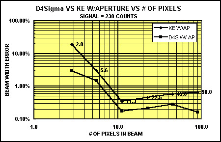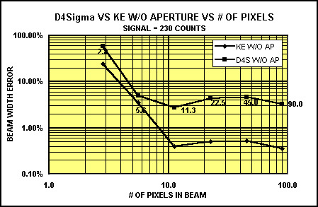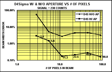 Figure 4 shows a comparison of the knife-edge method of measurement of the beam width vs. the D4. When an aperture is used, the D4 measurement is slightly more accurate than the knife-edge measurement. It should be pointed out that all of these measurements are less than 1% error. Thus until the pixels become less than 8, the measurements are within experimental electro-optic accuracy, and both measurements would be totally acceptable.