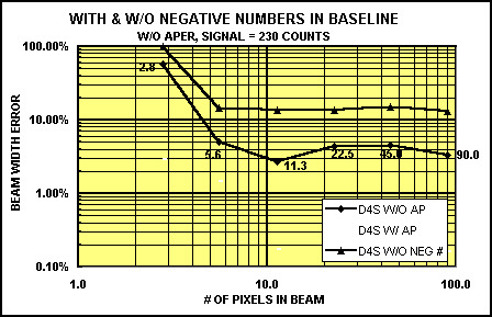 Figure 6 shows the effect of keeping negative numbers in the baseline. Without keeping negative numbers, only positive noise components are kept. This is the way most digitizers work. With only positive noise components, the measurement would attribute all of the positive noise components to be partially signal, and thus measure a beam larger than in actuality. In this figure we see that with an aperture, the D4 measurement is approximately 5 times better with the negative noise components considered, than without.