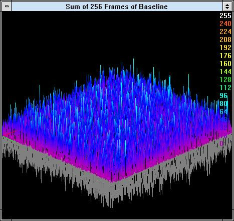 With attenuation, the beam was reduced to the point where it was not visible in the display. To show the accuracy of the baseline calibration, the beam was first blocked completely, and the baseline was summed over 256 frames. Figure 11 shows a 3D picture of this noise field. Notice the large amount of noise. The negative noise components are shown in gray, going below the colored positive noise components.