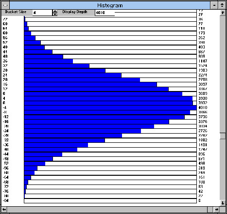 The LBA-300PC produces a histogram of all signals. Figure 12 shows the histogram of the 256 sum noise baseline from Figure 11. In the histogram the noise is centered very close to zero, with roughly a Gaussian distribution plus or minus about zero. A close inspection of Figure 12 shows that the noise is centered slightly below zero. This is because the camera which had only been turned on for about 15 minutes was still warming up and the baseline was drifting. Thus, even though the measurement was made immediately after an Ultracal, during that period the baseline drifted just slightly, giving this small baseline offset. Spiricon's "Mantra" is "Ultracal early, and Ultracal often."