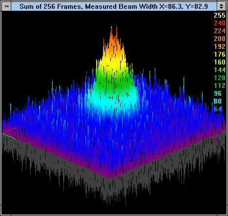 The utility of frame summing signal processing is shown with a low intensity beam. A laser beam signal was attenuated until it was buried in the noise so that the peak was approximately 1 digital count. The noise was approximately 3 digital counts. For reference, Figure 10 shows a 3D picture of the beam at its full intensity.