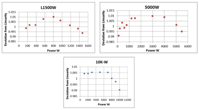 In order to verify this, models L1500W, 5000W and 10K-W against an L1500W whose linearity was tested at PTB National Laboratory in Germany. The sensors were measured at lower powers directly against the master standard and at higher powers using a beam splitter to split off a percentage of the beam to the master standard and the main beam going to the unit under test. These measurements have shown that these Ophir sensors are well within the claimed limits of linearity as shown by the graphs below.