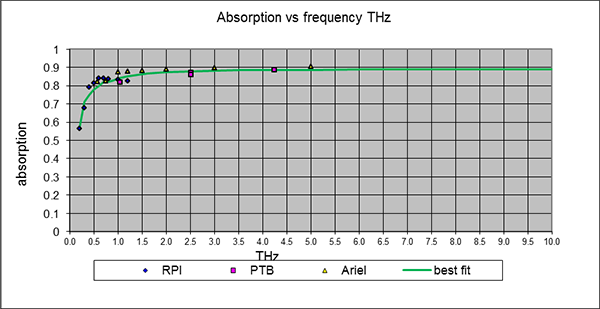 Ophir has measured the absorption of the absorber over various THz spectral regions at leading laboratories involved in THz research including the Rensselaer Polytechnic Institute (RPI), Ariel University and the PTB national laboratory in Germany. The measurements are shown below:
