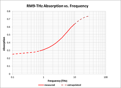 The RM9-THz is a variation of our very sensitive RM9 sensor series with lock in amplifier and has a special absorber surface that absorbs much more than typical absorbers in the THz region. Other absorbers absorb on the order of 10% or less but the Ophir absorber absorbs from 25% to 75% thus making meaningful calibration possible. Once we know the absorption in the visible (about 98%) and the absorbance at THz frequencies, then we can calibrate the sensor for THz frequencies.