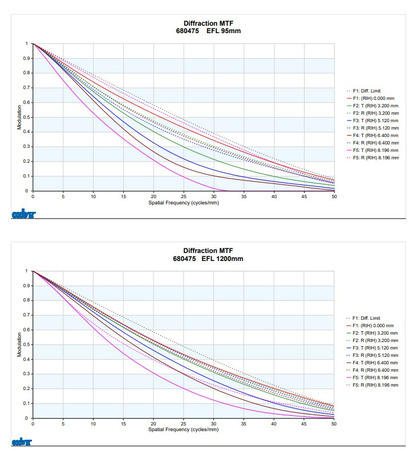 - Fig. 4 shows the MTF graphs of the SupIR 60- 1200mm f/5.5 lens at both NFOV and WFOV. Similar to the MTF performance of the 60-1200mm f/4 above, also in this case, the Sagittal MTF at both the WFOV and NFOV is close to the diffraction limit over the whole focal plane, while the Tangential component is lower.