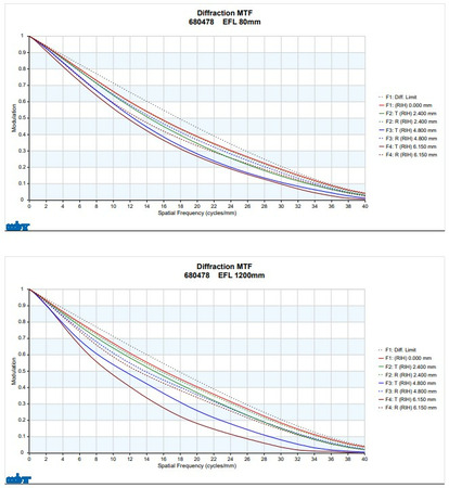 - Fig. 3 describes the MTF charts of the 60-1200mm f/4 lens at both NFOV and WFOV. These charts show the Sagittal (S) and Tangential (T) components of the MTF as a function of the spatial frequency at different field positions across the focal plane for both WFOV and NFOV. As can be seen, the Sagittal MTF at both the WFOV and NFOV is close to the diffraction limit over the whole focal plane, while the Tangential component is lower, especially at the WFOV.