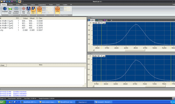 In the example above, we found that when rotating the NanoScan 90 degrees, the yaxis continued to measure 1040 microns; if the beam was truly elliptical, it should have measured 905 microns instead. The x-axis continued to measure around 900 microns after this rotation, owing to the fact this slit was not damaged.