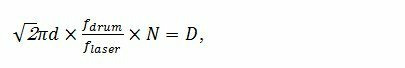 where d is the drum diameter, f is the frequency of the drum or laser, respectively, N is the number of pulses per profile, and D is the minimum allowed laser beam diameter.