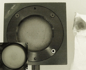 Two types of damage can occur from overheating of the sensor housing. The first is coating failure. This is fairly common and will result in a large discoloration of the coating surface. This discoloration is not removable by cleaning. In this situation the absorber must be replaced due to inconsistent absorption across the surface. Refer to Figure 3.