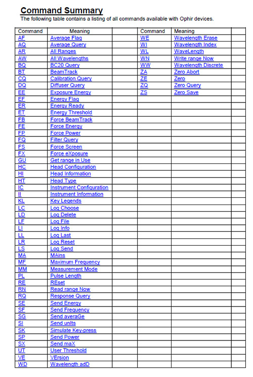 This document contains a description of the various commands that are used for remote control of Ophir meters. For each command, we list which devices support the command as well as providing examples when necessary and listing limitations, as applicable.