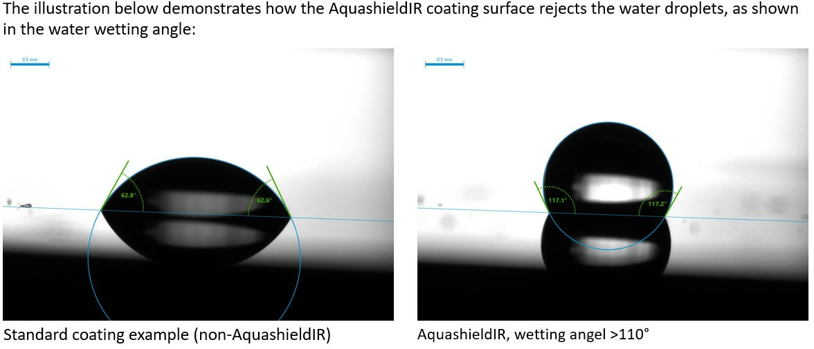 - Enhanced Visibility in Wet Conditions: By repelling water droplets, AquaShieldIR™ enables IR imaging lenses to perform optimally in wet conditions. Whether it's rain, fog, or operating in a maritime environment, AquaShieldIR™ ensures clear imaging and reliable performance.